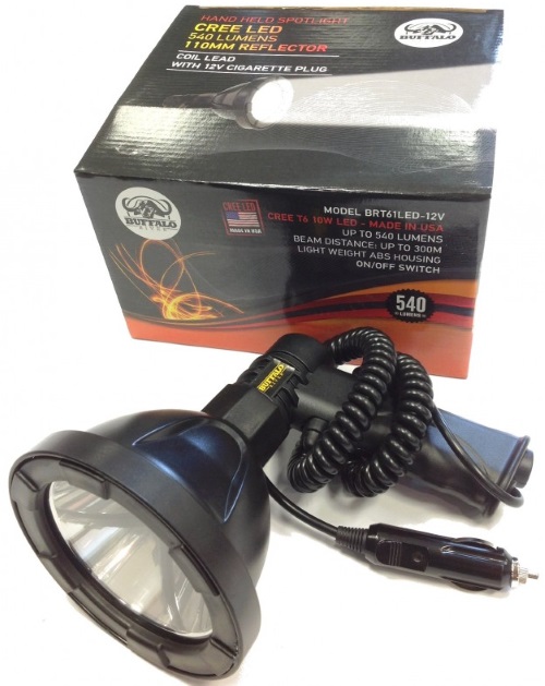 The new Buffalo Cree River handheld light offers 540 lumens and features a super bright Cree T6 10W LED which helps to give its 300m beam range and super long run-time - at least 5x longer than most normal lamps. It runs from a standard 12v cigarette plug and is turned on/off using the trigger type switch. The lamp is made with a light weight ABS housing and has a 110mm reflector which makes it easy for carrying around. Red filters are also available as an extra.