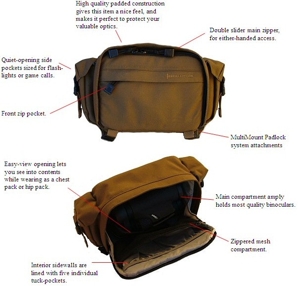 A note from the guy who dreams these things up: For several years, people have been asking me to make a binocular case. Usually what they've asked for is something similar to the cases that are already on the market, and since those things already exist, I never really saw the point. Most of what's out there has seemed limiting to me, with a narrow purpose and too many straps. And since I'm a wearer of backpacks, I didn't want to have more straps wrapped around my body than was necessary.