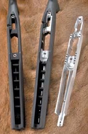 Pillar Bedding (shown on the left) - All centerfire bolt action stocks come standard with aluminum pillar bedding, traditionally a gunsmith installed option costing over $100. Our molding process and our desire to produce the best product available compelled us to include pillar bedding as a standard feature. Pillar bedding utilizes aluminum bosses embedded in the stock at critical mounting locations. Aluminum pillar beds guarantee an accurate, rock-solid action fit that will not shoot loose. Aluminum conforms to the rifle action making aluminum superior even to a steel pillar bed. Aluminum pillar bedding is not found standard on any other injection molded stock.