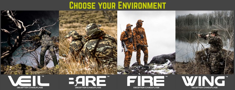 Continuing the success of Veil Camouflage, these new deception camouflage patterns suit browner terrain as well as a high visibility pattern and a specific waterfowl pattern designed for duck shooters.
