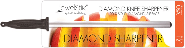 A kitchen gem once available only to professional chefs is now available to the public. the jewelstik diamond sharpener is lightweight, well balanced and easy to use. Its lens shaped steel shaft permits more efficient sharpening than ordinary cylindrical-shaped tools by allowing more surface to be sharpened in less time. a few swipes across the shaft are all that is needed to keep a perfectly sharp edge. The edges produced are flawless, gap free, razor-sharp and long lasting. available in 5", 10" and 12" lengths in both professional and consumer widths. |