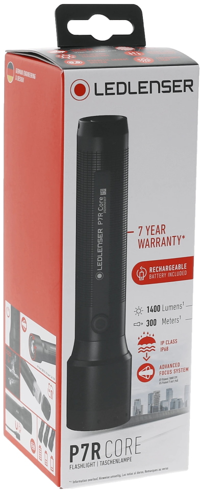 The versatile LEDLenser P7R Core Rechargeable Torch offers exceptional power. it also offers forward-thinking technologies like the Smart Light Technology for custom light functions. The lamp is powered by a 21700 Lithium-ion battery, which can be easily changed by opening the end cap. Thanks to our Flex Sealing Technology, the P7R Core is protected against water and dust, and can even be used underwater for a short time. Our patented Advanced Focus System works with up to one meter of water depth. This makes the P7R Core the ideal torch for every occasion.