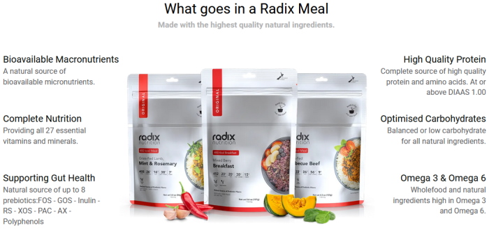 Go anywhere - Lightweight, compact, and easily prepared. Radix meals are ideal for tackling even the harshest of environments, making them a great choice for adventures, expeditions, and outdoor sports. |