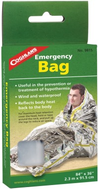 The Coghlan's Survival Bag provides instant protection against rain, wind and cold. Emergency shelter doubles as a ground sheet. Can be used as a distress signal or for storing gear. Also helps prevent hypothermia by holding in body heat. Made from 3-mil polyethylene.