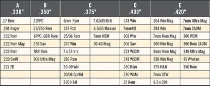 A Series - 17 REM, 218 BEE, 22-250 REM, 220 SWIFT, 221 FIREBALL, 222 REM, 222 REM MAG, 223 REM, 243 WIN, 25/06 REM, 250 SAV, 257 ROB, 260 REM, 264 WIN MAG, 270 WIN, 280 REM, 30 TC, 30/06 SPRG, 30/30 WIN, 30/40 KRAG, 300 H&H, 300 RCM, 300 WBY MAG, 300 WIN MAG, 303 BRIT, 308 MARLIN, 308 WIN, 32 SPECIAL, 338 RCM, 338 WIN MAG, 340 WBY MAG, 35 REM, 35 WHELEN, 350 REM MAG, 375 H&H, 416 REM MAG, 45/70 GOVT, 450 BUSHMASTER, 6.5 CREEDMOOR, 6.8 SPC, 6MM BR REM, 6MM REM, 7.62X39, 7MM BR REM, 7MM REM MAG, 7MM/08 REM, 7X57 MAUSER, 8MM REM MAG, 8X57MM MAUSER