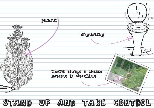 * Stand up at public toilets to avoid unhygienic seats and smelly portable loos.